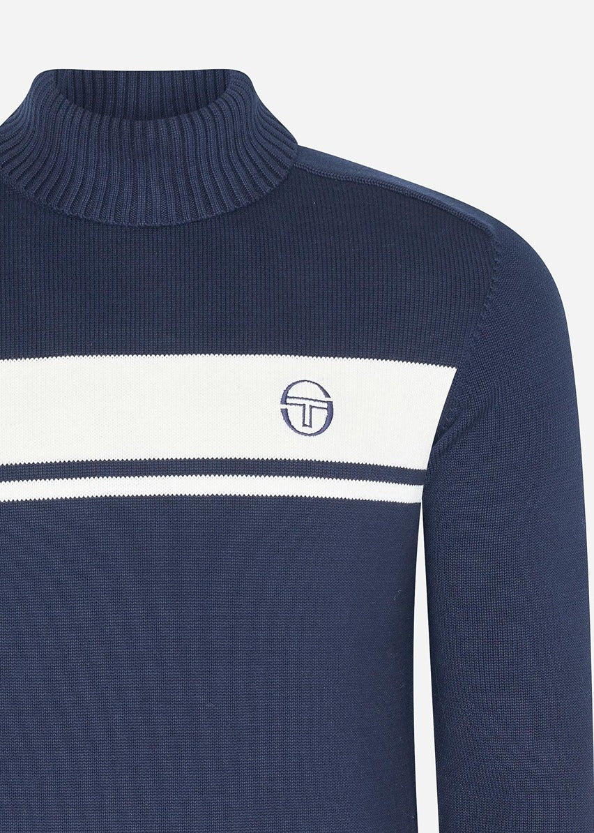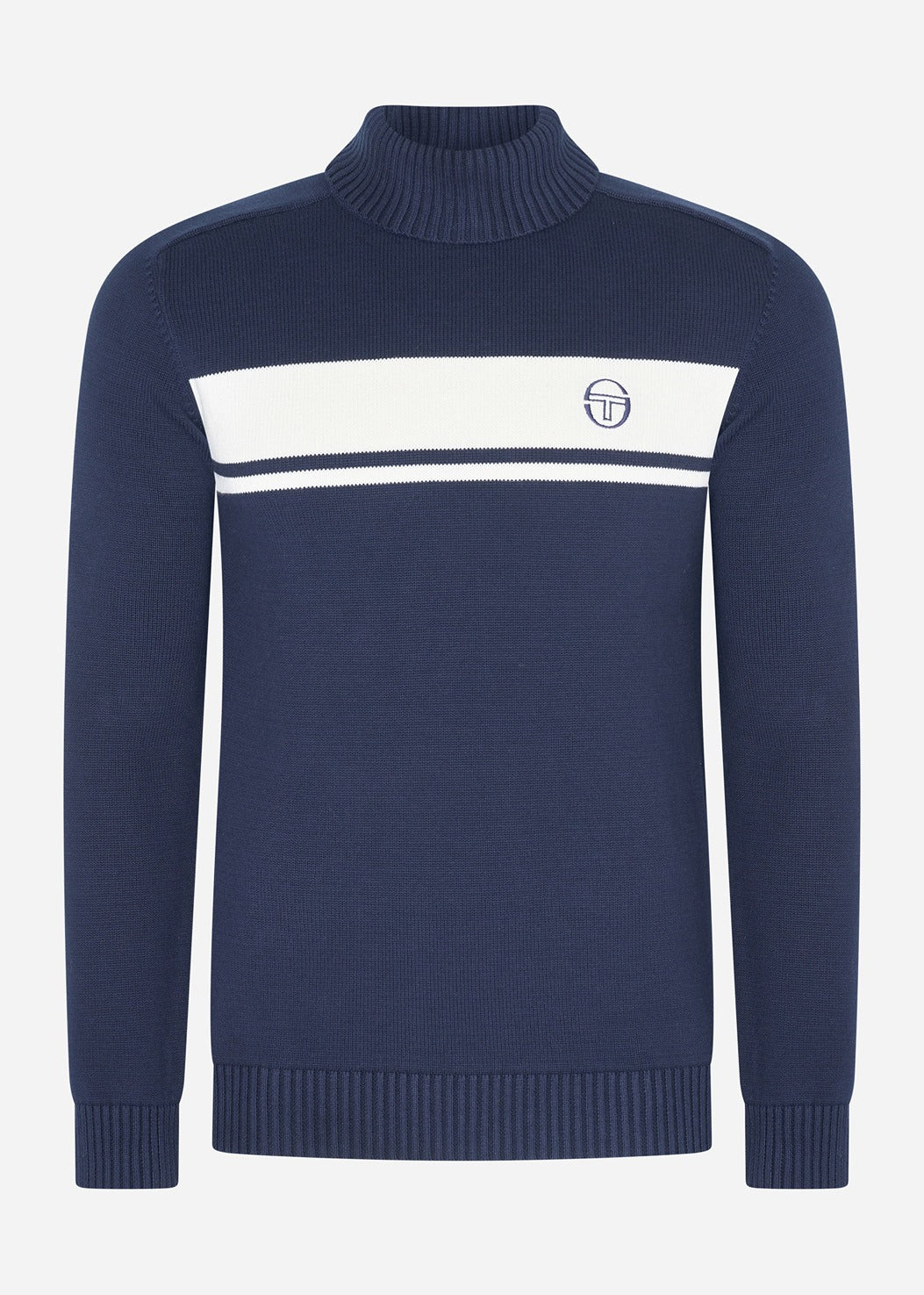 The Sergio Tacchini 'Damarindo' Roll Neck Jumper in Maritime Blue offers a premium look with a soft cotton knit. This regular fit pullover features a chunky ribbed turtleneck, cuffs and waistband for an extra comfortable fit. The iconic white Damarindo stripe design and embroidered 'ST' monogram make it perfect for a stylish, sporty look.