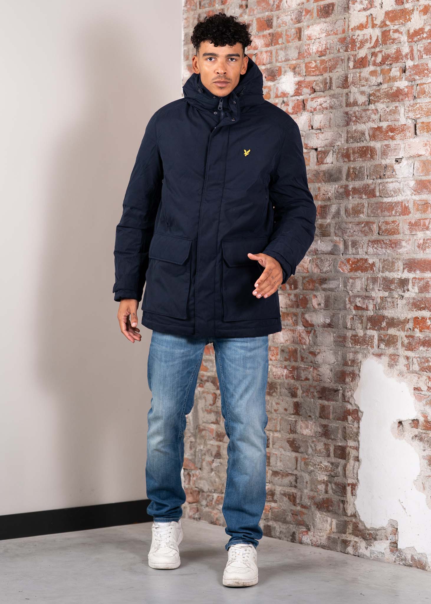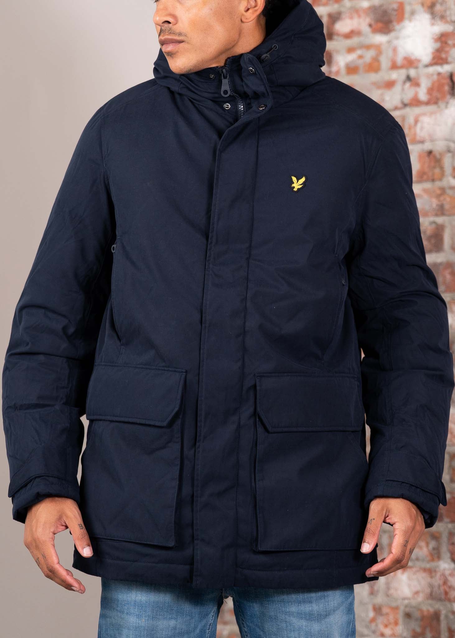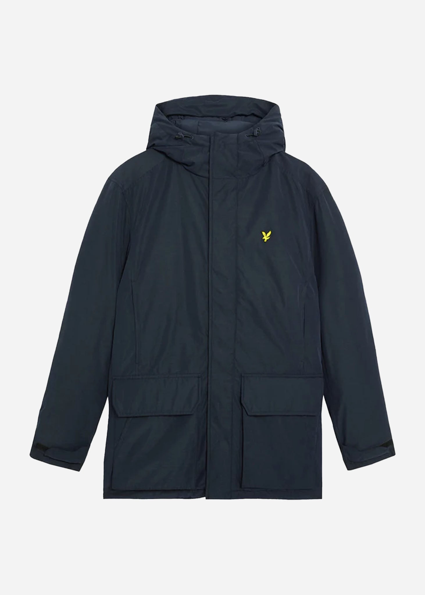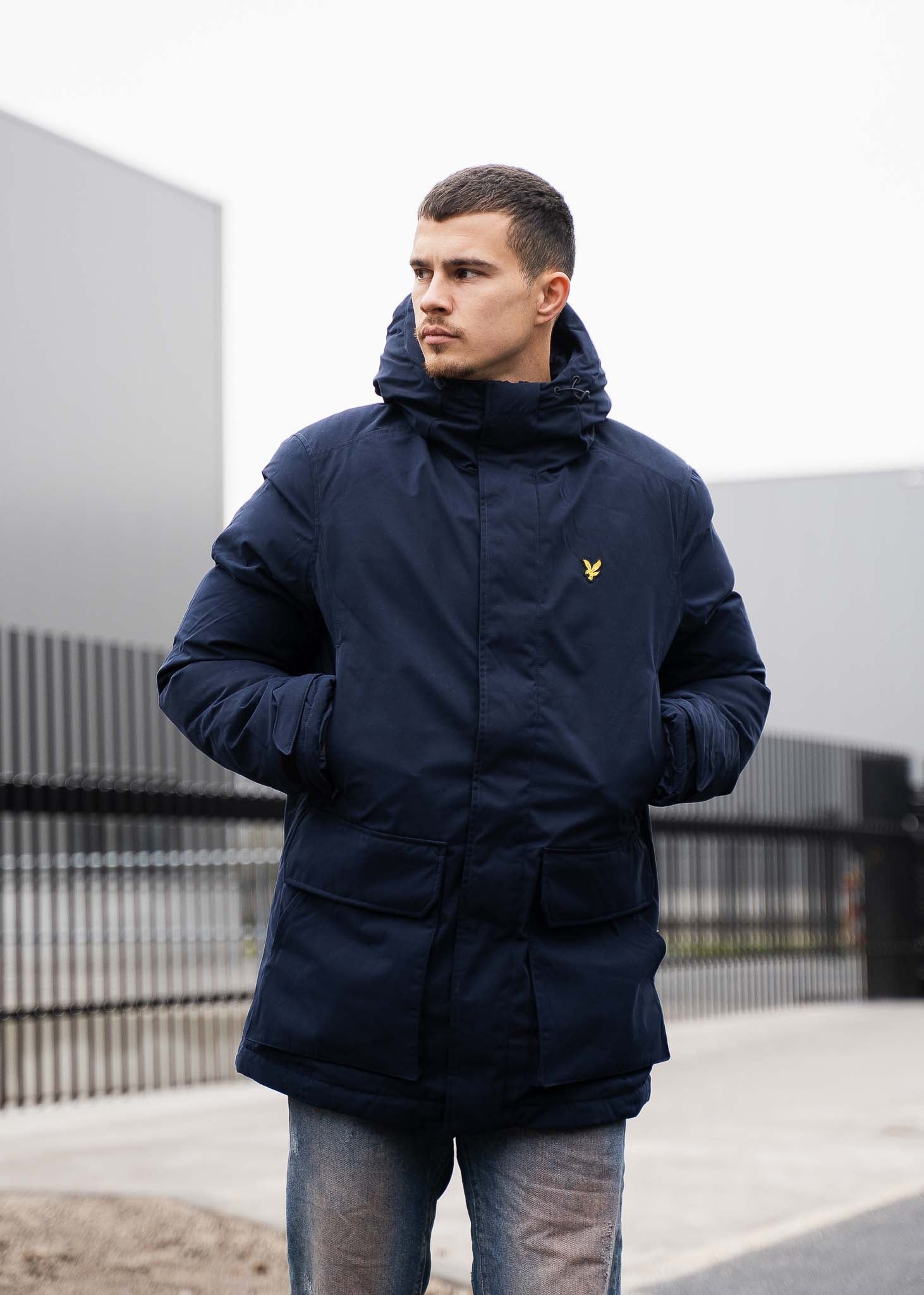 The Lyle & Scott Membrane Parka is designed for both style and protection. It comes in deep blue, featuring a high collar and hood for optimal weather protection. Large patch pockets and a concealed zip create a sleek silhouette, while the gold eagle logo on the chest adds a touch of luxury.