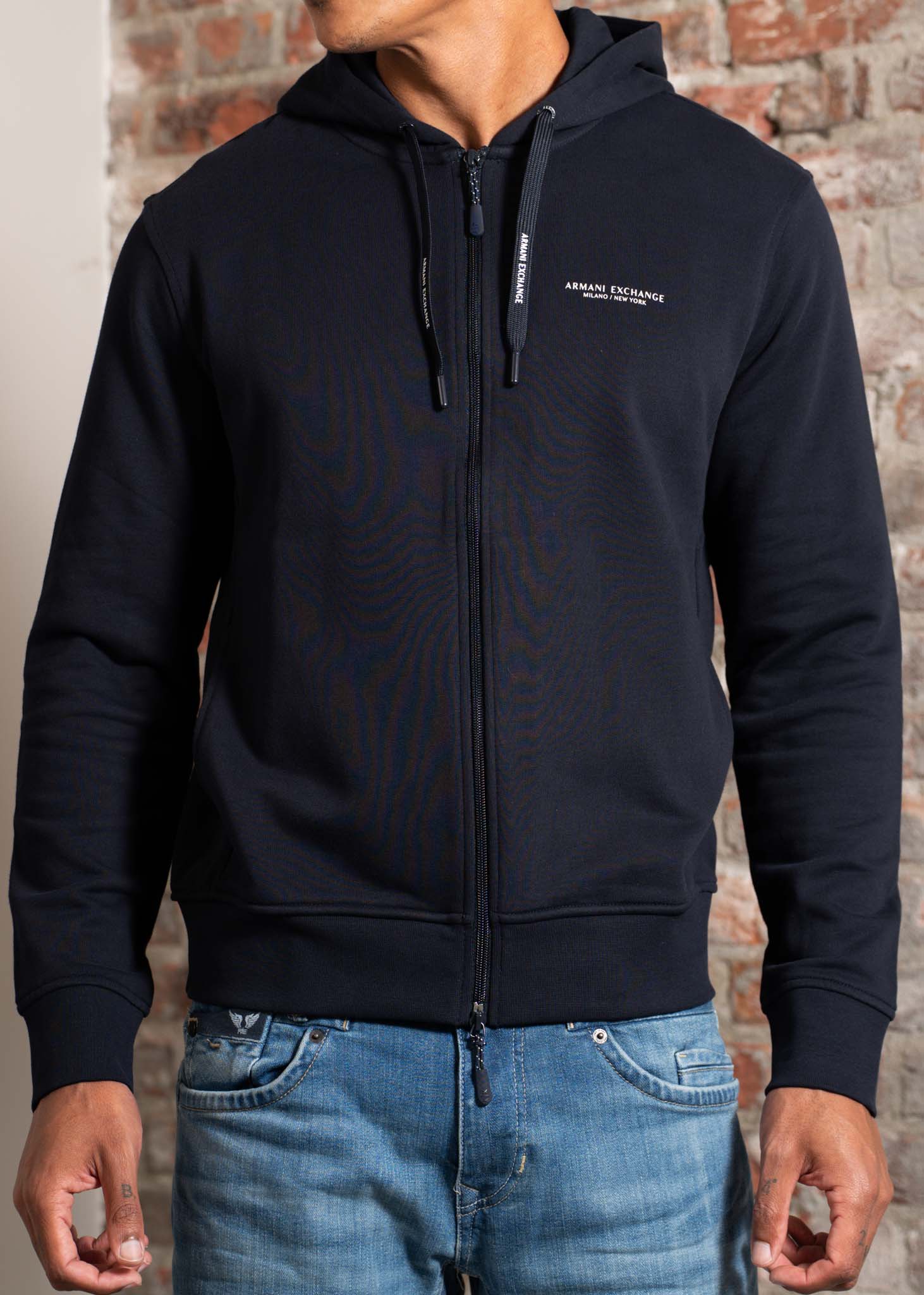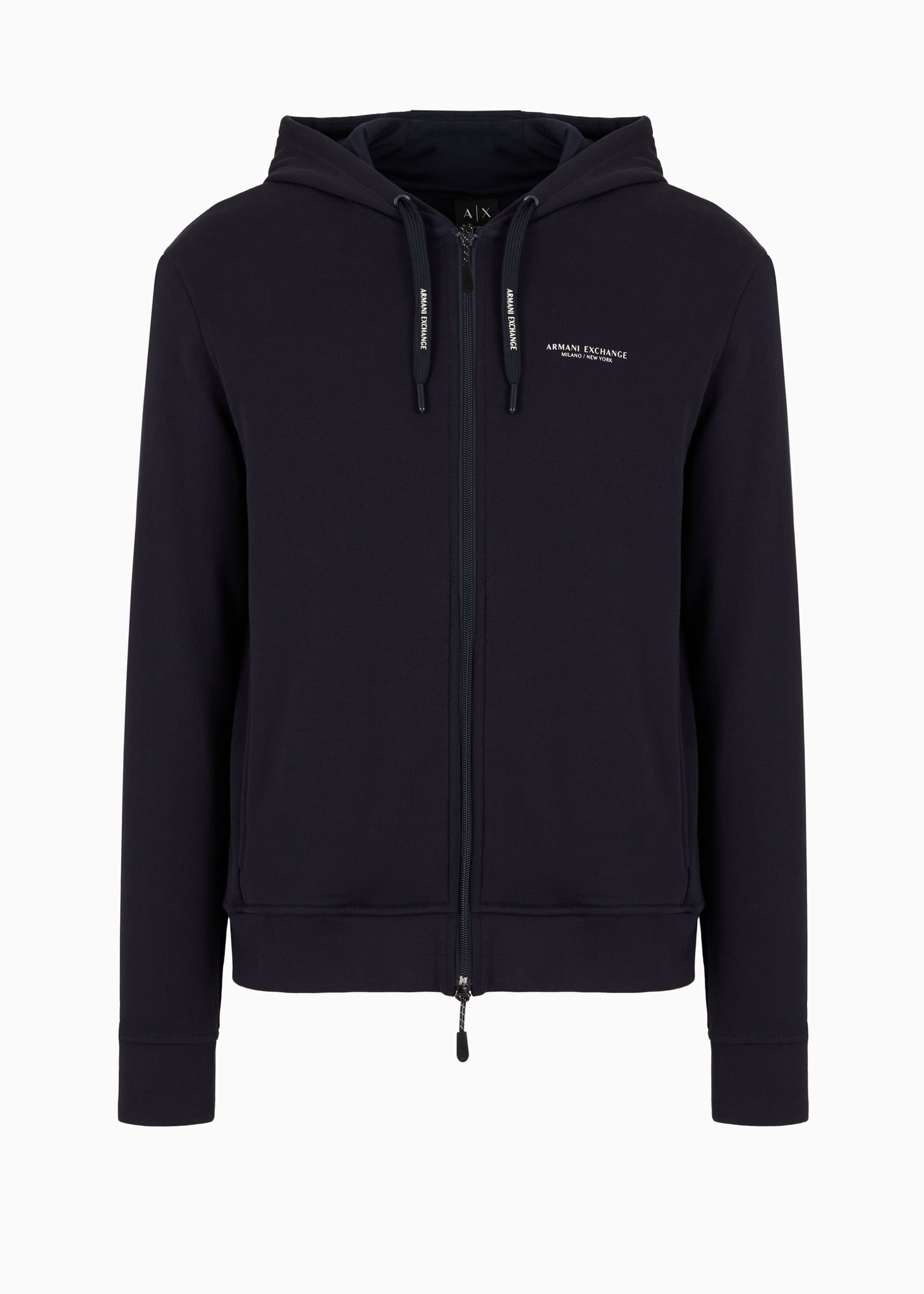 Sporty cardigan in soft stretch cotton, designed for everyday comfort. The cardigan features an adjustable hood with drawstrings, a central zip fastening and side pockets. Finished with elasticated ribbed cuffs and a subtle Armani Exchange logo for a sleek, minimalist look.