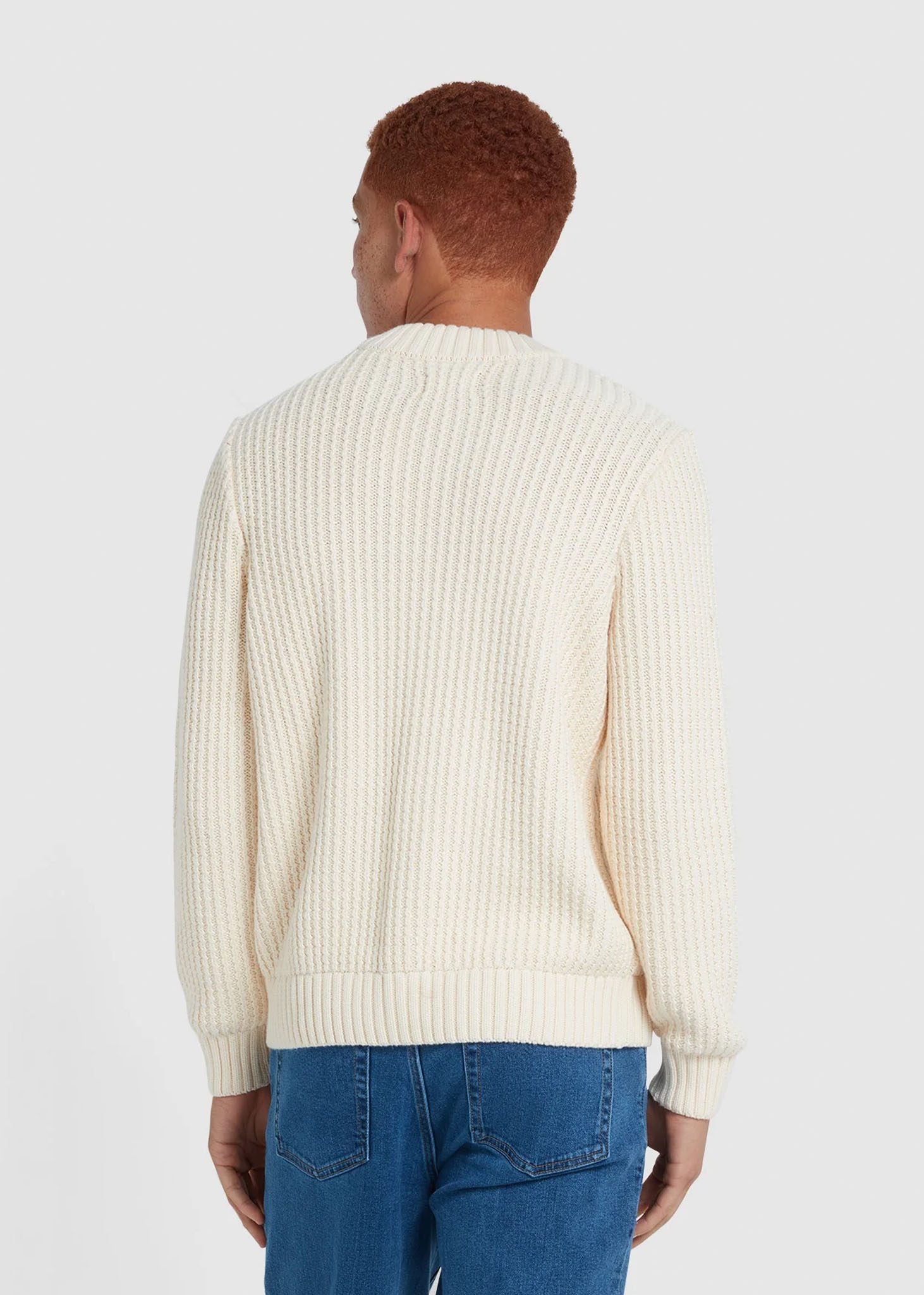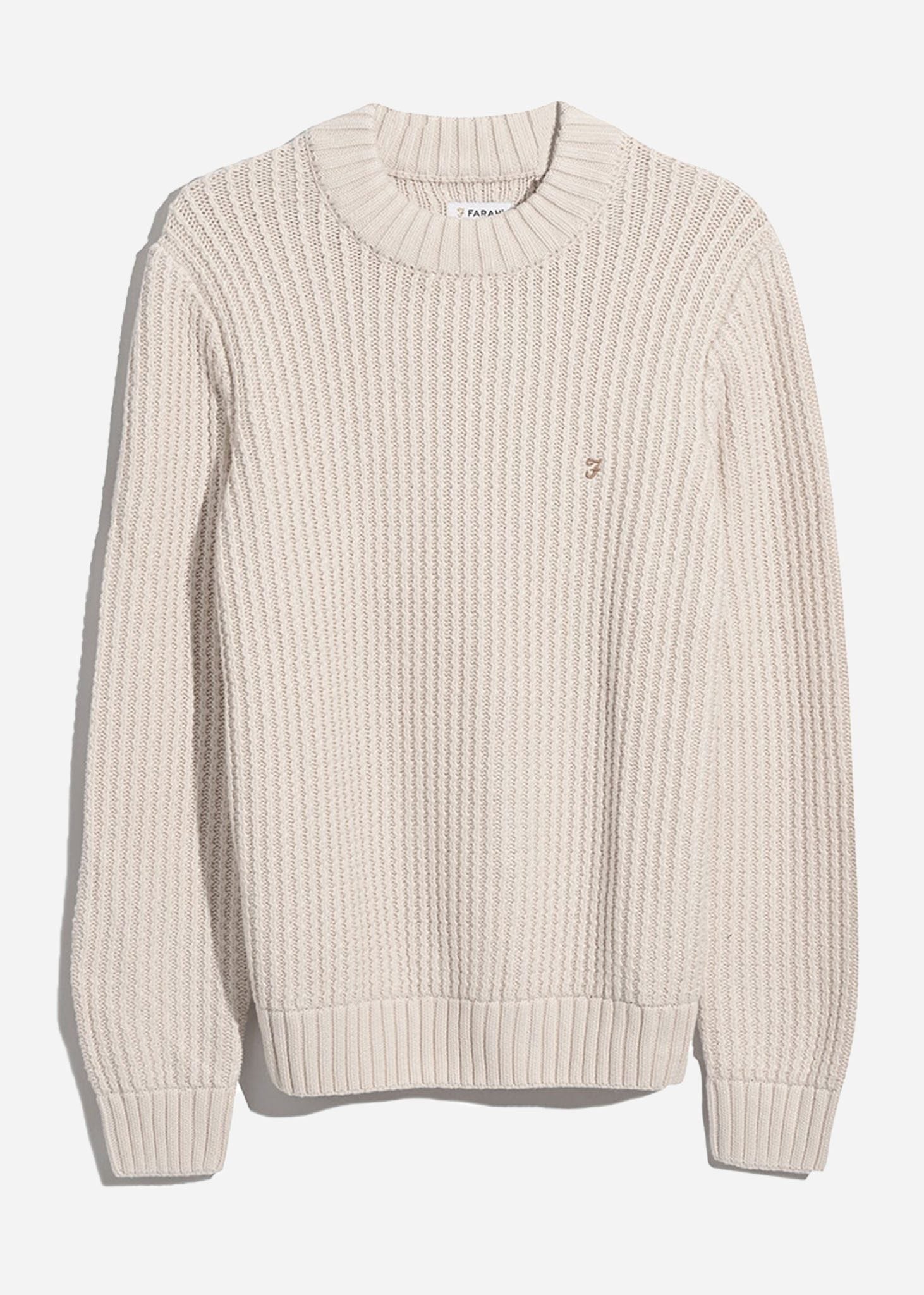 The Burlington Fisherman Knit Sweater in Cream is a luxurious and comfortable choice, made from 100% organic cotton. This regular fit sweater features a classic crew neck and is crafted with a premium organic cotton fabric and a sturdy fisherman's stitch. The sweater features a double bonded ribbed collar, ribbed cuffs and hem and is finished with an embroidered Golf F logo. Ideal for a refined look and easy to care for in the machine.