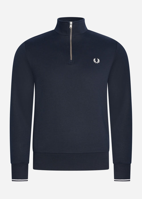 An all-time bestseller and an absolute must-have in any wardrobe, the Fred Perry Half Zip sweatshirt strikes the perfect balance between casual comfort and timeless elegance. Crafted from cotton-rich French terry, this minimalist design has a regular fit with signature Fred Perry details such as twin tipped cuffs and embroidered Laurel Wreath. The exposed silver zip fastening adds a stylish touch to this versatile piece.