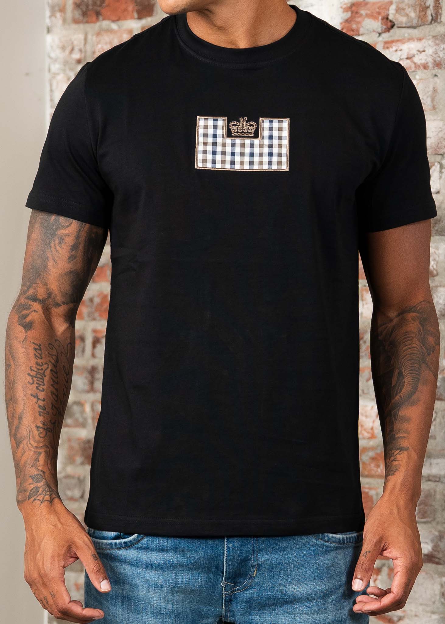 - Check appliqué with embroidered crown